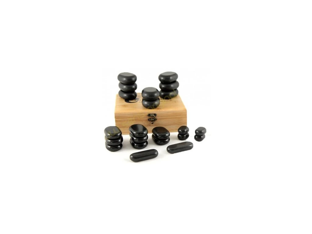 A magas hőtartó képességű professzionális lávakő készletet bambusz dobozban forgalmazzuk. A készlet 22 db fekete, természetes vulkanikus eredetű lávakövet tartalmaz a következő méretekben: